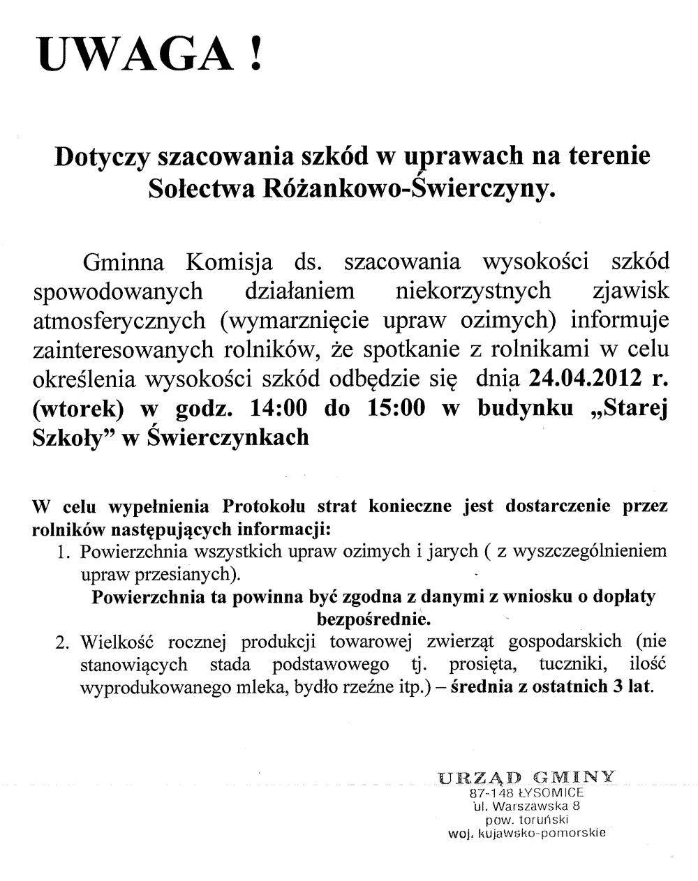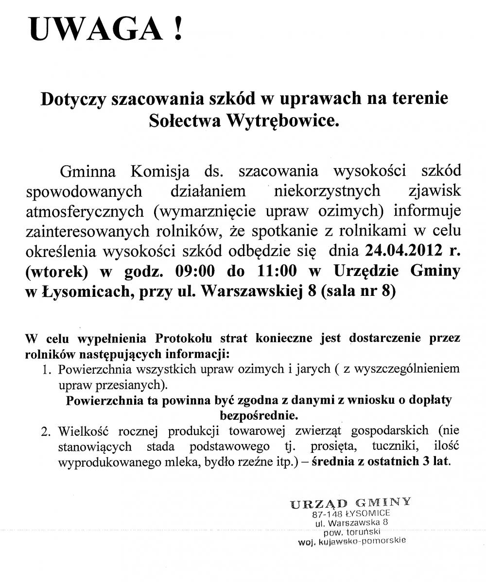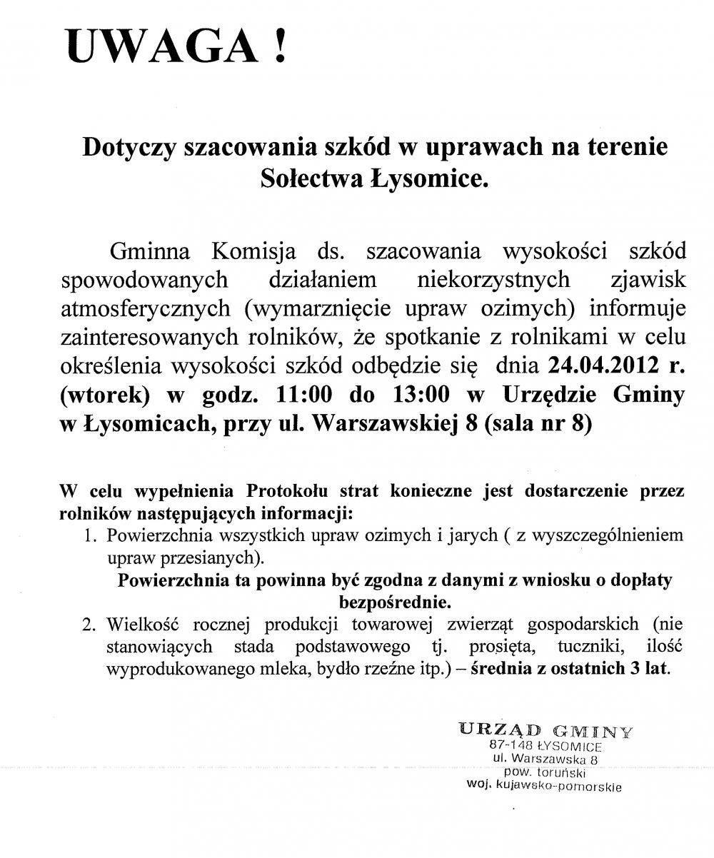 Zebranie wiejskie w Łysomicach 16 kwietnia 2012 r. odbyło się w Centrum Animacji Kultury w Łysomicach zebranie wiejskie. Tematem zebrania było: Sprawozdanie Sołtysa i Rady Sołeckiej z wykonania planu rzeczowo – finansowego za 2011 r. oraz Sprawozdanie z pracy Sołtysa i Rady Sołeckiej za 2011 r. W zebraniu uczestniczyli m.in. przedstawiciele Urzędu Gminy Łysomice (wójt, sekretarz, pracownicy urzędu), Rady Sołeckiej, Spółki Wodnej, radni gminy, policjant opiekujący się naszą gminą oraz mieszkańcy Łysomic. Wójt Piotr Kowal omówił kilka zagadnień poruszonych przez mieszkańców Łysomic a mianowicie: 1. instalacje solarne na terenie gminy, 2. wykonanie melioracji na ul. Łąkowej, Zbożowej, Owsianej i Jęczmiennej, 3. przystanek autobusowy na ul. Warszawskiej, 4. położenie asfaltu na ul. Ogrodowej, 5. organizacja dożynek w 2012 r. na terenie zespołu pałacowo- parkowego w Łysomicach. Marek Komuda