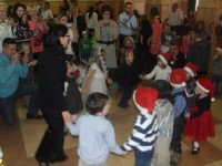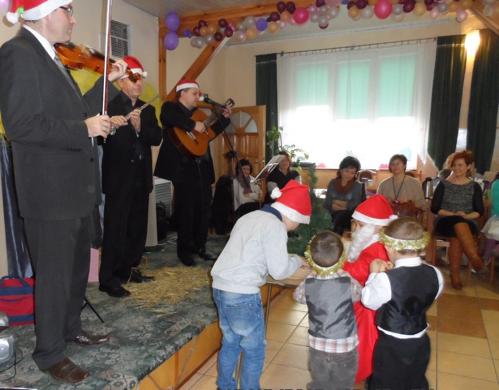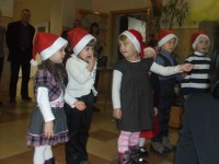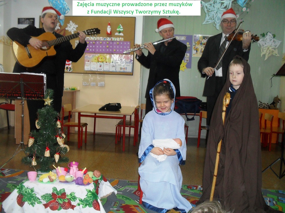 W nastrój świąteczny wprowadziły nas: kolędowanie z muzykami z Fundacji Wszyscy Tworzymy Sztukę oraz występy dzieci z poszczególnych przedszkoli. Po części artystycznej nastąpił moment, na który najbardziej czekały dzieci – odwiedziny Świętego Mikołaja. Na koniec wszyscy usiedliśmy do świątecznie przystrojonego stołu na poczęstunek przygotowany przez rodziców.