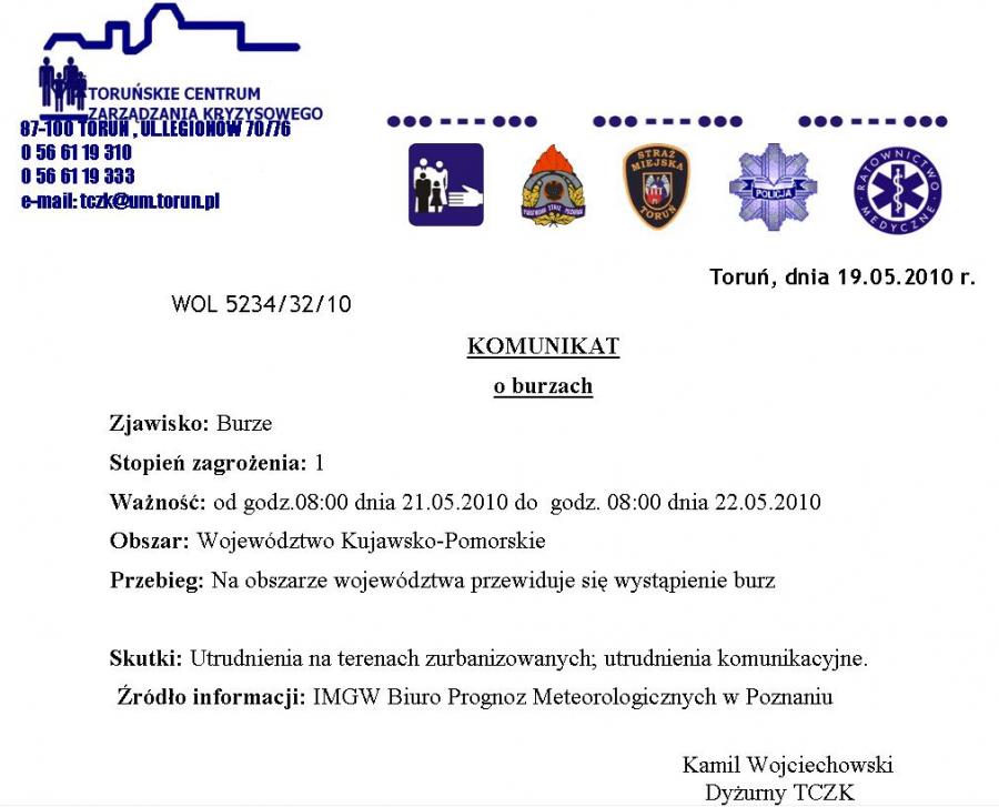na celu ochronę żywego inwentarza, a także o natychmiastowe opuszczenie ogrodów działkowych na Rudaku i przy ul. Przybyszewskiego. Zastępca Szefa Toruńskiego Zespołu Zarządzania Kryzysowego Dyrektor Wydziału Ochrony Ludności -/ Tadeusz Wierzba Dyżurny Toruńskiego Centrum