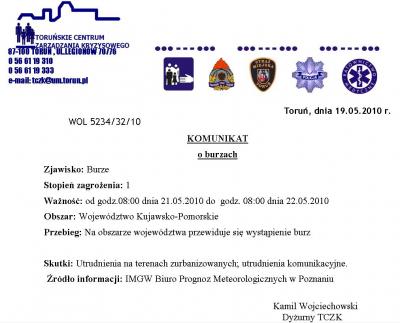 w Toruniu wynosił 500 cm. Z informacji otrzymanej z Instytutu Meteorologii i Gospodarki Wodnej Biura Prognoz Hydrologicznych w Warszawie oraz z Regionalnego Zarządu Gospodarki Wodnej – Inspektoratu we Włocławku wynika, że od dnia 21 maja 2010 r. obserwowany będzie gwałtowny wzrost poziomu wody w Wiśle, spowodowany przejściem fali wezbrania powodziowego. W nocy z dnia 21/22 maja 2010 r. poziom wody w Wiśle w Toruniu może osiągnąć stan od 800-830 cm.