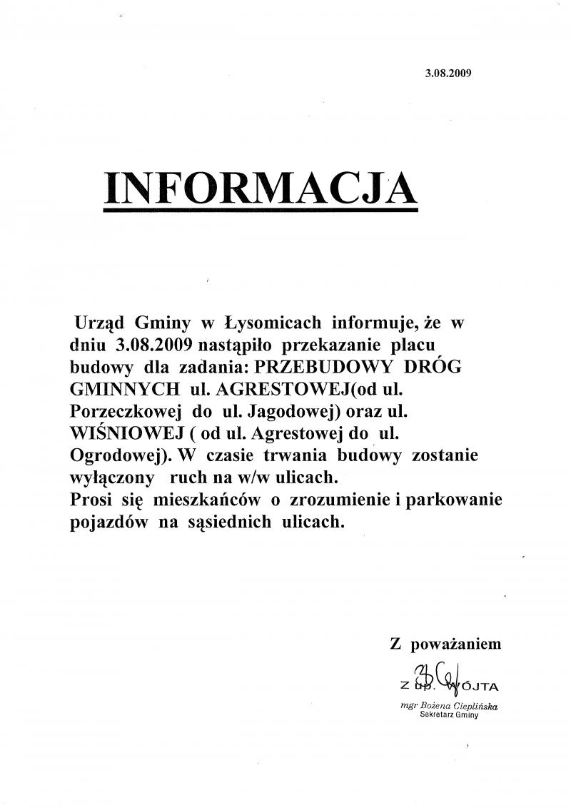 Łysomice, dn. 14.08.2009 r. INFORMACJA