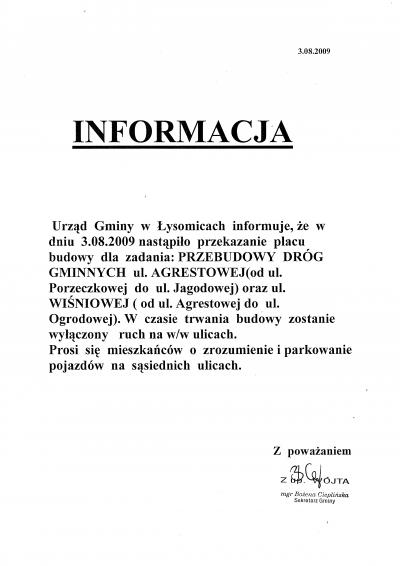Urząd Gminy w Łysomicach informuje, że od dnia 17.08.2009 r. rozpoczną się prace przy przebudowie ul. Agrestowej i ul. Wiśniowej w Łysomicach.
