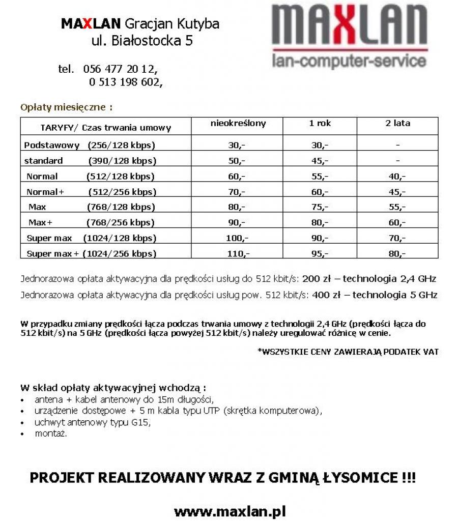 MAXLAN Gracjan Kutyba 87-100 Toruń ul. Białostocka 5 kom. 513 198 602 mail: maxlan@op.pl