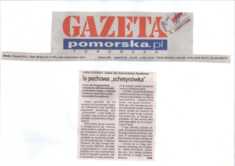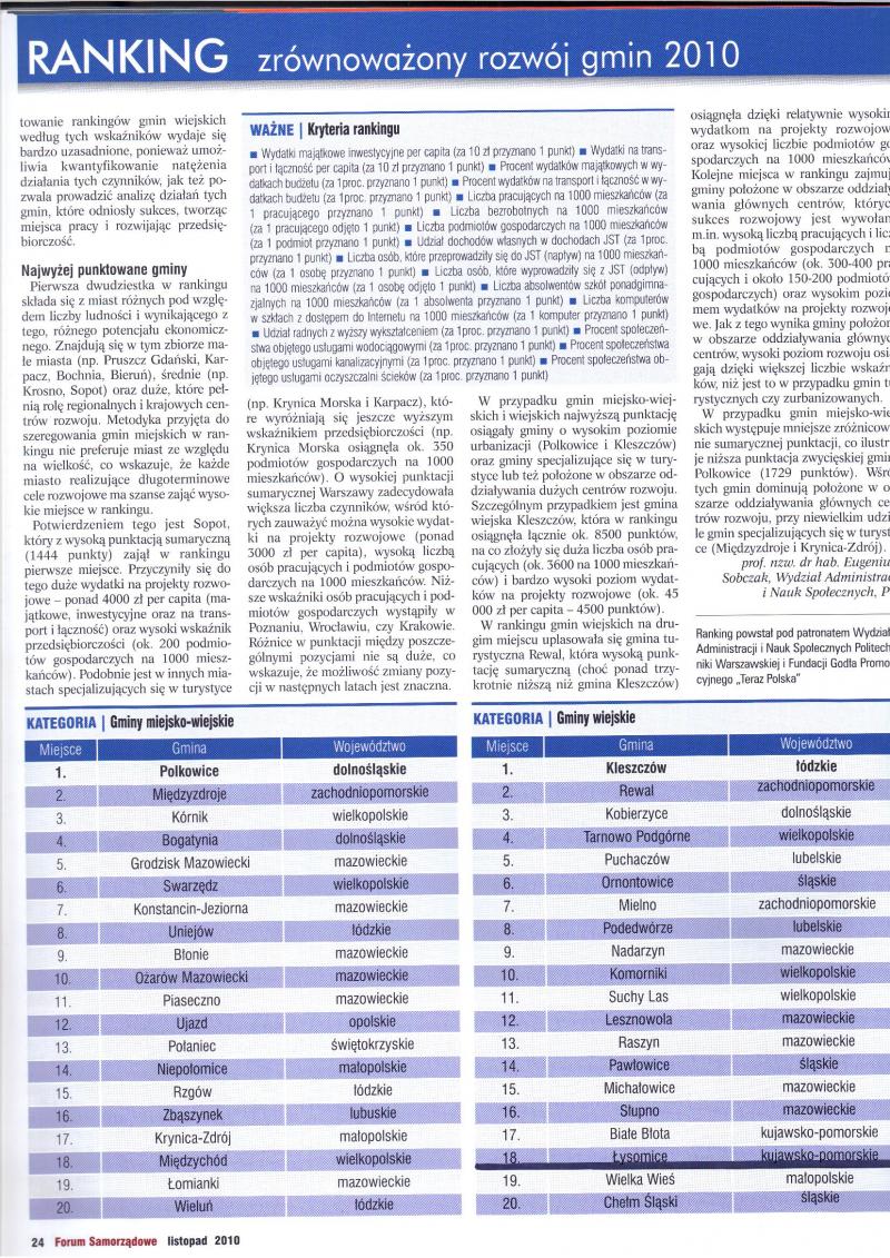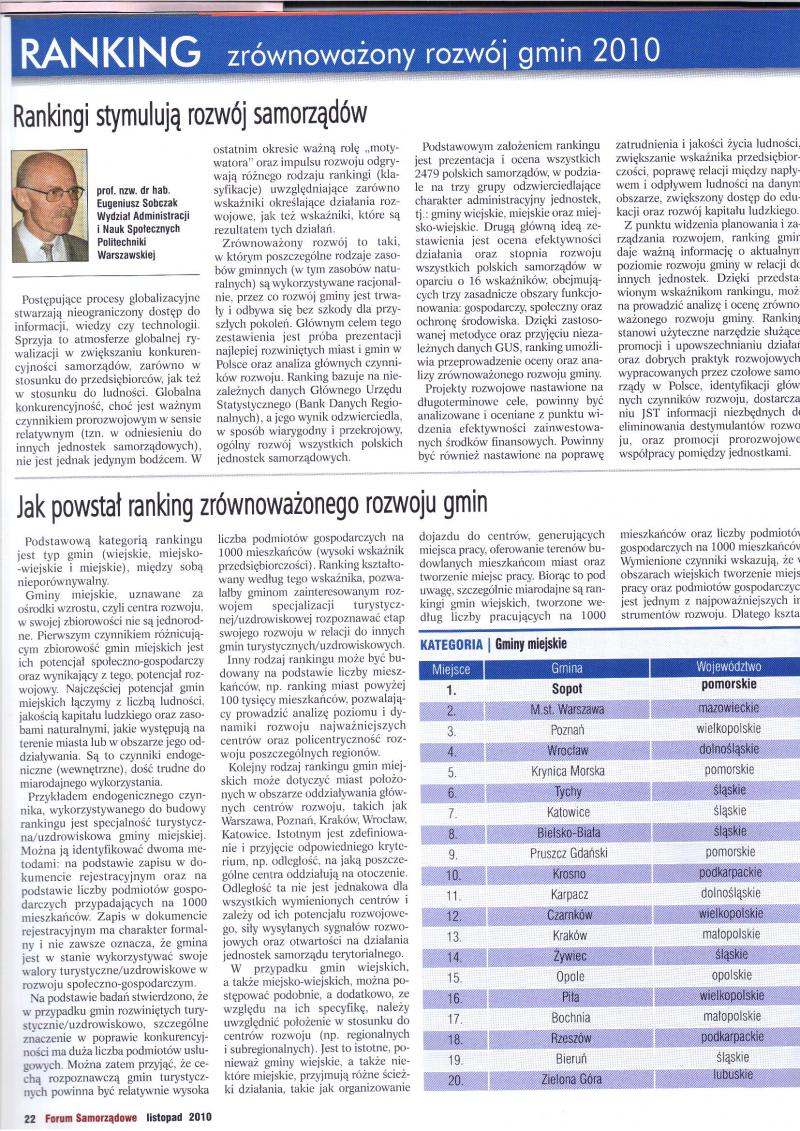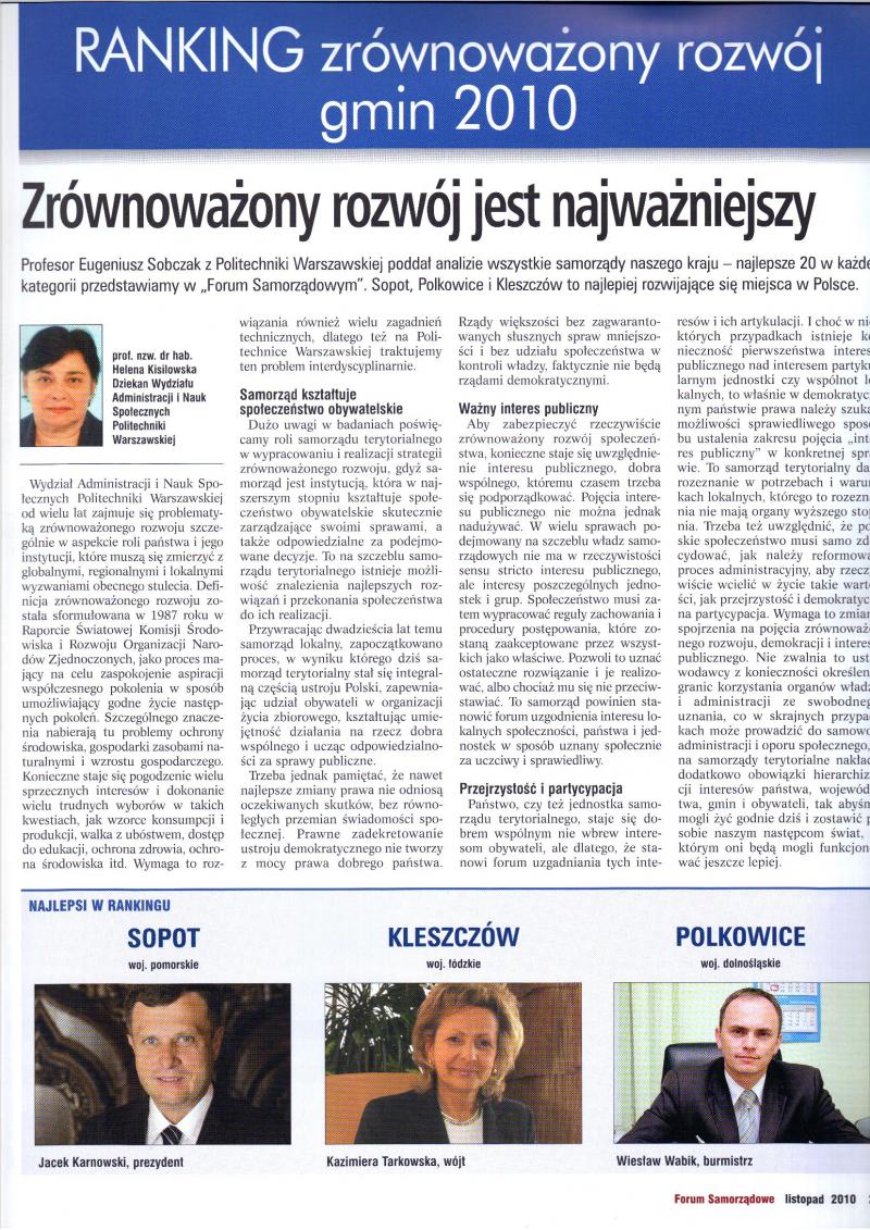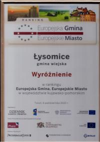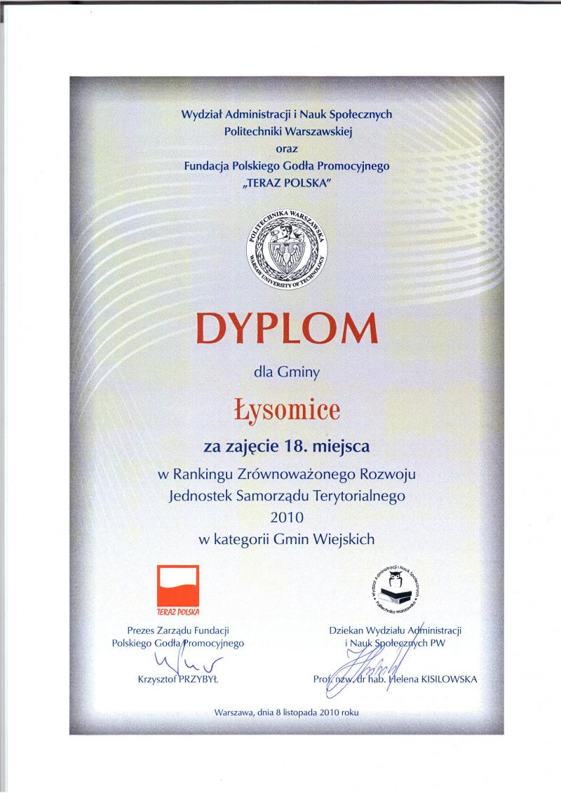 Odpowiedź na pytanie... Gmina Łysomice w polskich rankingach... Wójt i pracownicy Urzędu Gminy Łysomice doczekali się kolejnych sukcesów. W Rankingu Zrównoważonego Rozwoju Jednostek Samorządu Terytorialnego 2010 w kategorii Gmin Wiejskich zajęli 18 miejsce w Polsce. 9 listopada pracownicy podziękowali Wójtowi za wspaniałą współpracę i życzyli dalszych sukcesów. Ranking Europejska Gmina, Europejskie Miasto Po raz czwarty został zorganizowany przez dziennik Gazetę Prawną ranking Europejska Gmina Europejskie Miasto. Ranking ma na celu pokazanie, która gmina czy miasto ma największe osiągnięcia w pozyskiwaniu środków unijnych. Brane są pod uwagę wszystkie programy pomocowe, których beneficjentami są zarówno władze samorządowe, jak i przedsiębiorstwa, rolnicy i organizacje społeczne. Ranking obejmuje środki z unijnego budżetu w latach 2007-2013. Podstawą do oceny jest wartość przyznanej pomocy z UE, liczba realizowanych projektów oraz liczba mieszkańców według GUS. autor: M. Komuda LinkiWarto zobaczyćWarto zobaczyć